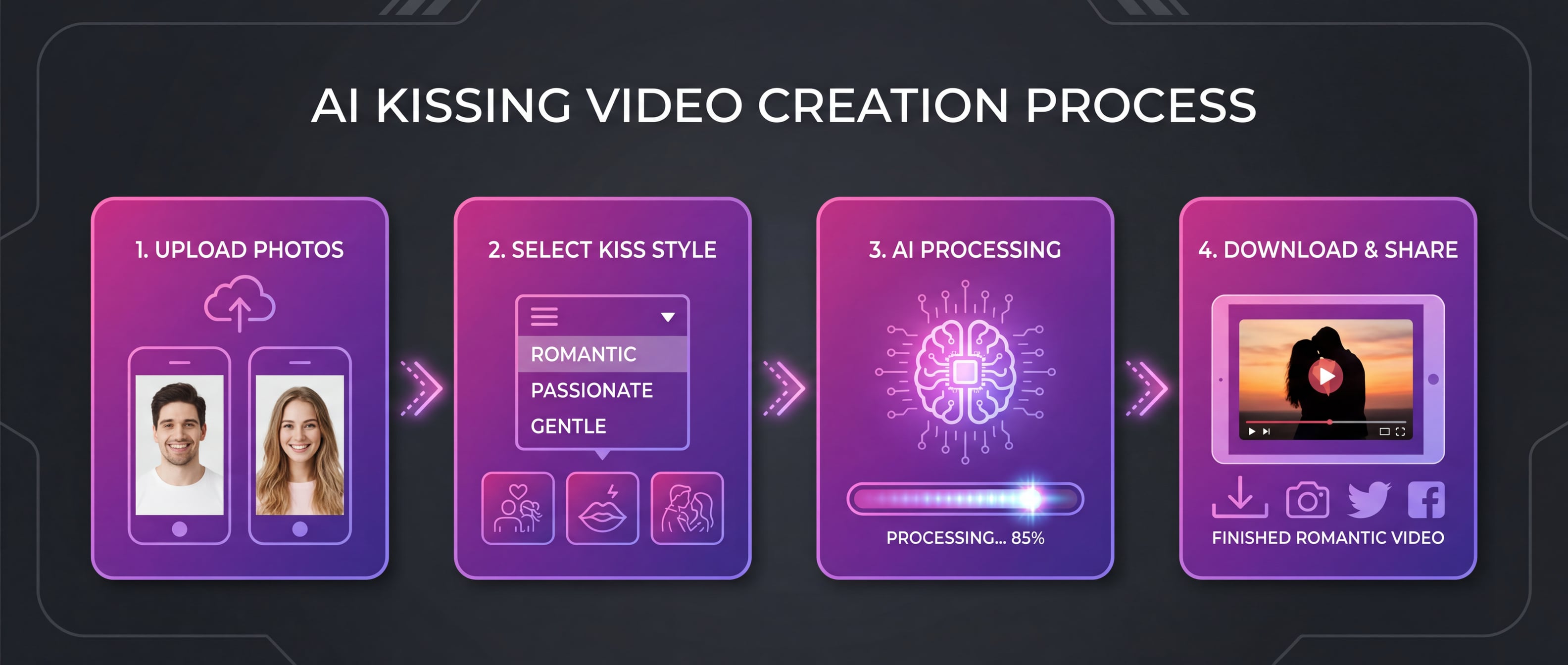 AI Kissing Videos: The most popular format, where static images are animated into short video clips (usually 5â10 seconds) showing a realistic kiss.