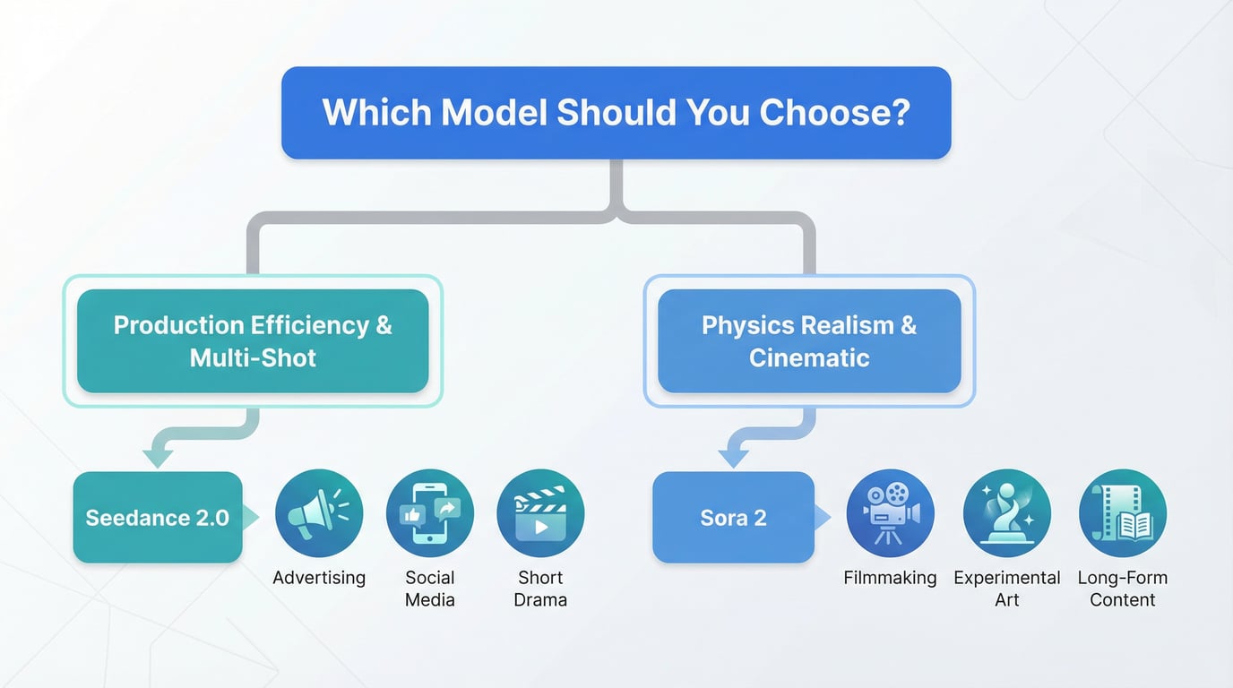 Content Type: Social media, advertising, and commercial content align with Seedance 2.0's strengths. Cinematic, experimental, and physics-intensive content benefits from Sora 2's capabilities.