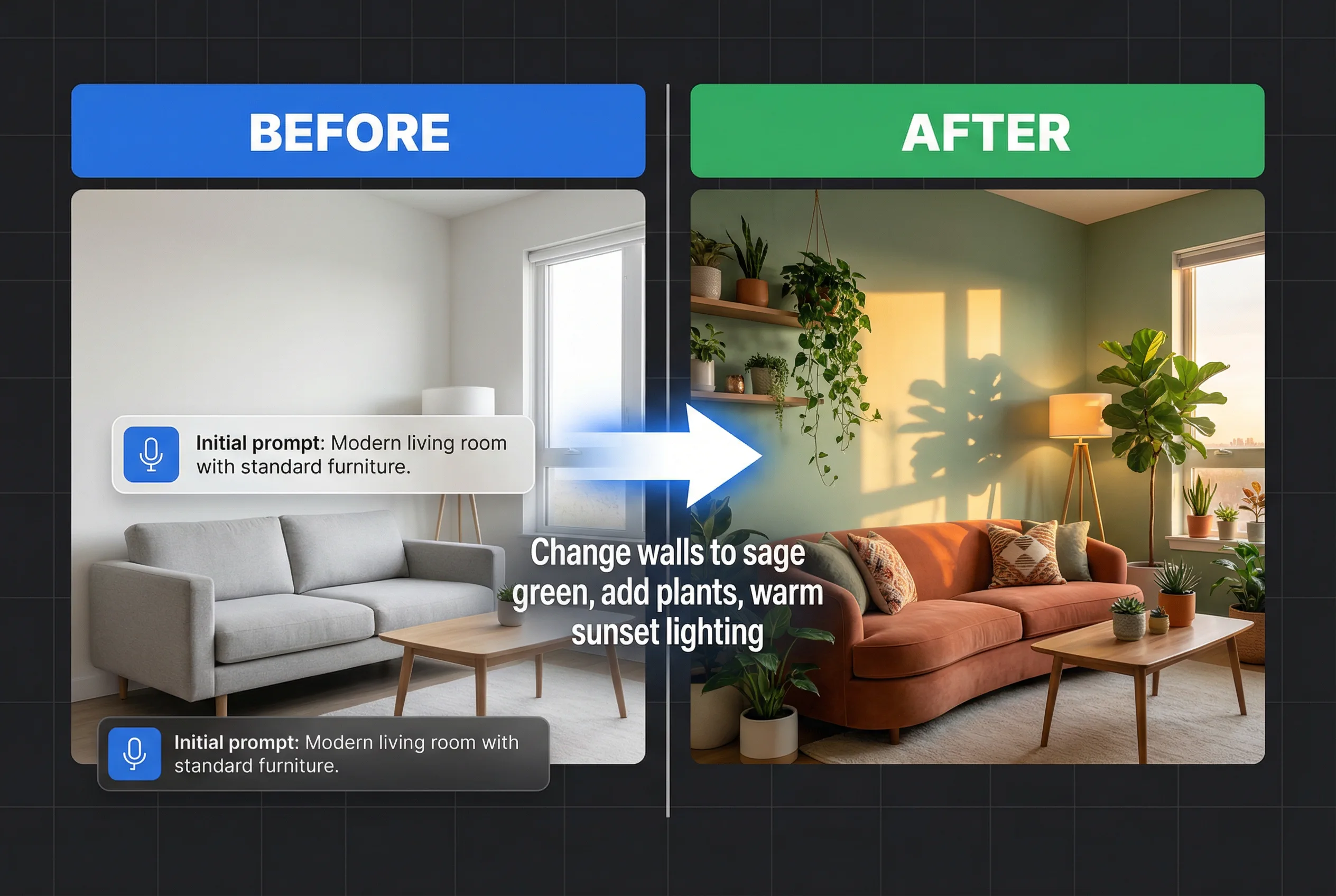Genera & Modifica: Crea la tua immagine. Non è perfetta? Non ricominciare da capo. Digita semplicemente un'istruzione di modifica come, "Rendi il cielo più drammatico" o "Cambia la sua camicia da blu a verde."