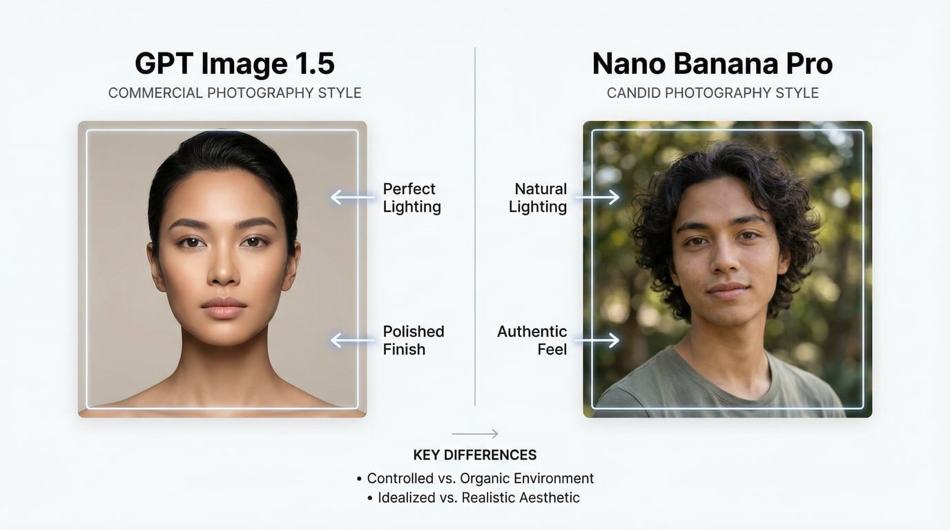 Estetik: GPT Image 1.5 "ticari fotoğrafçılık" görünümleri üretir—cilalı ve profesyonel ancak bazen gözle görülür şekilde yapay. Nano Banana Pro, birçok kullanıcının daha otantik bulduğu daha "doğal fotoğraf" estetiği üretir