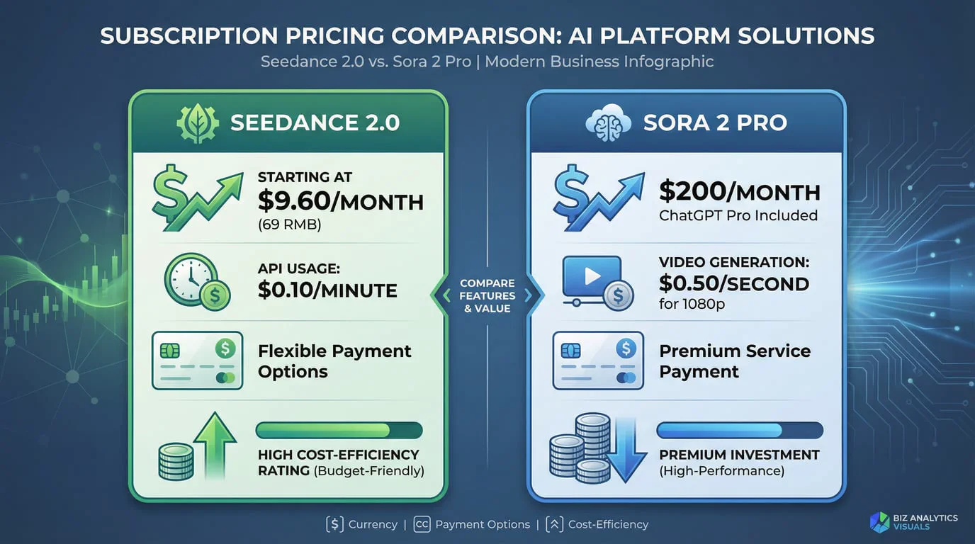 Sora 2 Pro, aylık 200 USD tutarında bir ChatGPT Pro aboneliği gerektirir. Bu abonelik, aylık 10.000 kredi değerinde Sora 2 Pro erişimi sağlar. ChatGPT Plus kullanıcıları (aylık 20 USD), aylık 1.000 kredilik sınırlı Sora 2 erişimi elde ederler ancak bu kademe 720p çözünürlük ve filigranlı 10 saniyelik videolarla sınırlıdır. Pro kademesi 1080p çözünürlüğü kilitler ve filigranı kaldırır; bu da onu profesyonel çalışmalar için asgari uygulanabilir seçenek haline getirir.