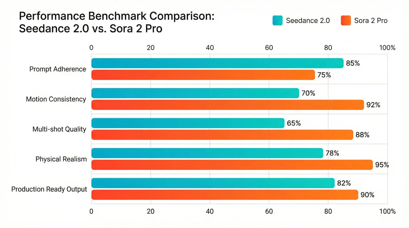 Birkaç bağımsız değerlendirme, bu modelleri kontrollü koşullar altında karşılaştırdı. 2026 başındaki test analizlerine göre Seedance 2.0, karmaşık fiziksel eylemleri işlemede %90'ın üzerinde başarı oranı göstererek şu anda mevcut olan en kurumsal sınıf alternatiflerden biri olduğunu kanıtladı.